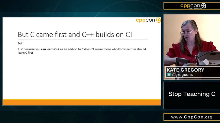Kate Gregory’s 2015 CppCon talk argues for skipping C fundamentals when teaching C++.